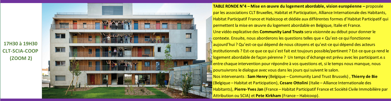 Ce salon sera INTERNATIONAL, avec la présence de personnes qui vivent en « habitats participatifs » (au sens large du terme), venant de divers pays européens : France, Suisse, Angleterre, Italie, etc. et est organisé en partenariat avec Habitat Participatif France – Urbamonde – et Habicoop.