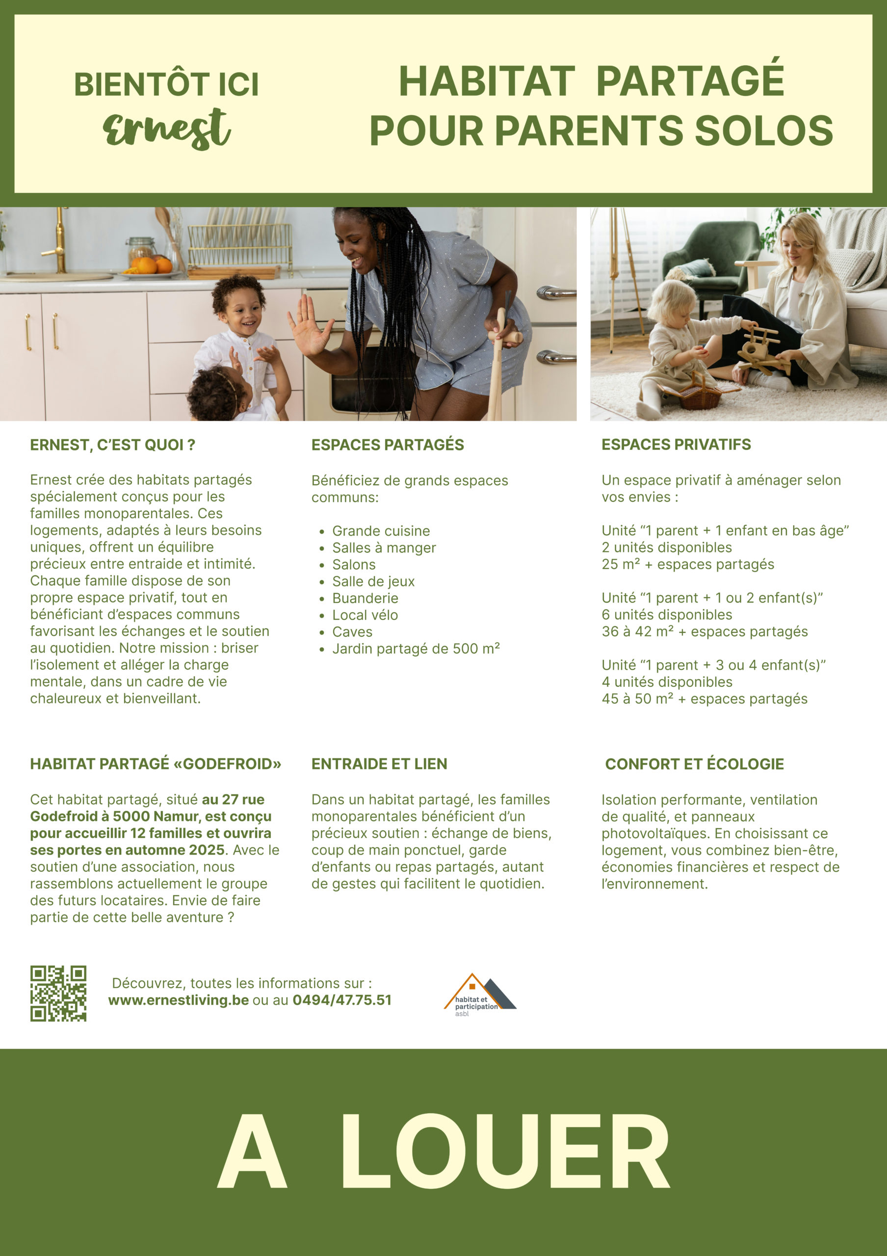 Ernest ouvre à l’automne 2025 l’habitat partagé « Godefroid » dans le centre de Namur. Ernest développe des habitats partagés pour familles monoparentales. Ces logements offrent un équilibre unique entre entraide et intimité : chaque famille dispose de son espace privatif, tout en profitant d’espaces communs qui encouragent le soutien mutuel et les échanges. L’ambition d’Ernest ? Briser…