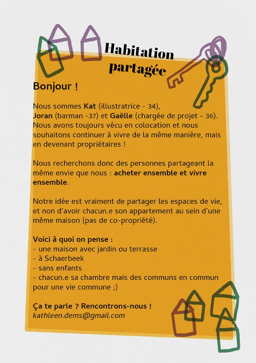 Hello ! Toutes les infos sont dans l’image 😉 Nous serions ravi.es de faire connaissance avec toutes personnes intéressé.es à acheter une maison à Schaerbeek pour créer une colocation dans laquelle nous serions toustes propriétaires. N’hésitez pas à nous envoyer un email à kathleen.dems@gmail.com ! Joran, Kat & Gaëlle