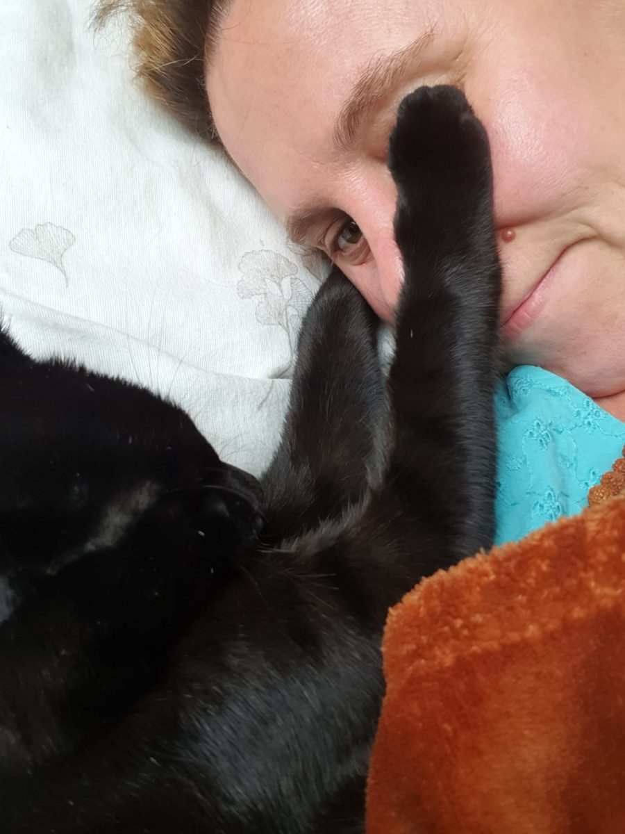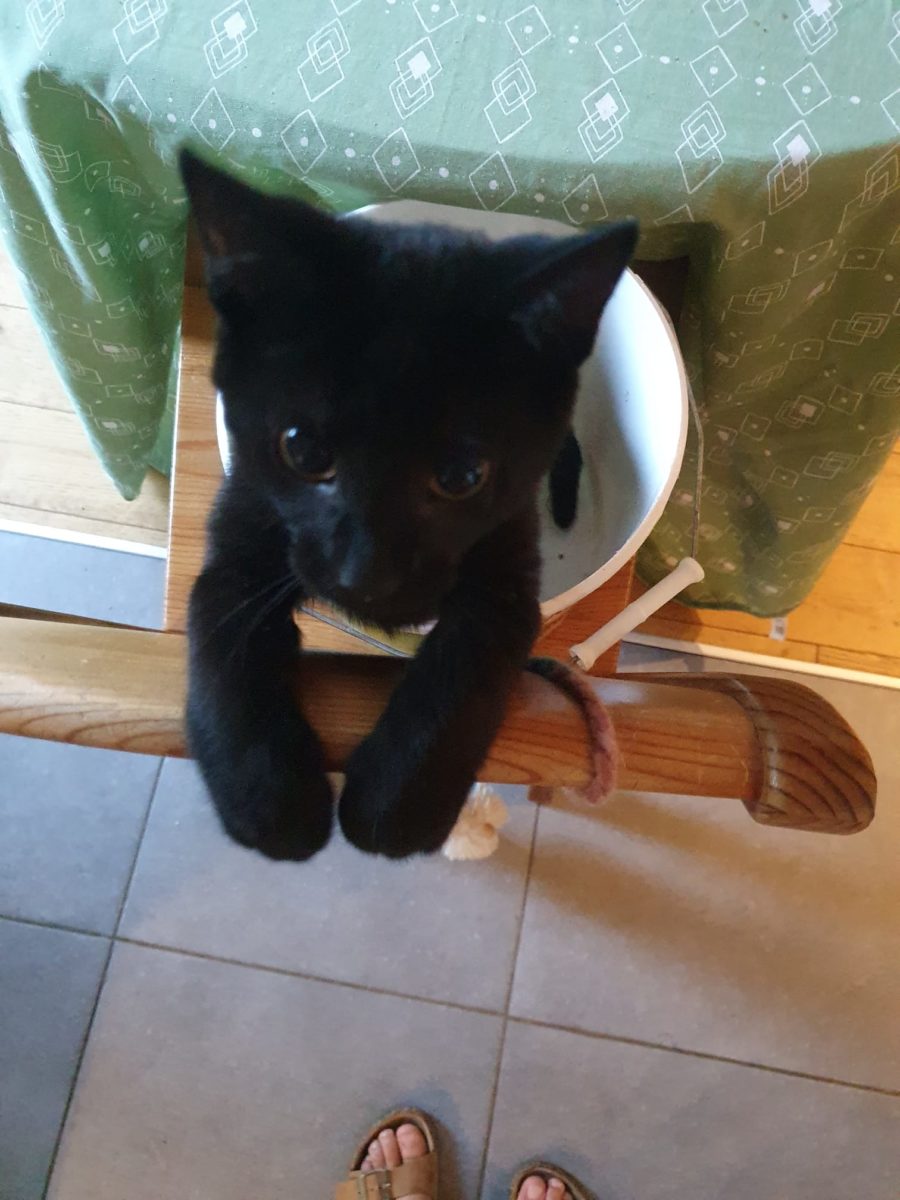 je suis accompagnée de ma compagne de vie Zéphyr, qui n’a que 6 mois et qui est une adorable petite doudou,qui est un Petit chat trouvé dans un champ à un mois seulement sans maman,qui a besoin de présence, qui est un vrai petit pot de glue d’amour et de jeux,très amitueuse,mais qui n’aime pas tant la solitude mais qui adore les gens !