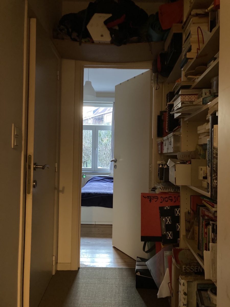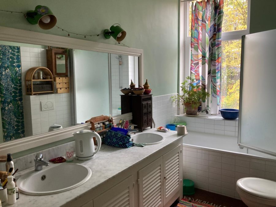 La chambre à louer est plutôt petite (9m2) mais dispose d’une grande bibliothèque sur le palier et la fenêtre donne sur le jardin. La salle de bain est à partager avec Miriam, Zoï et son fils.