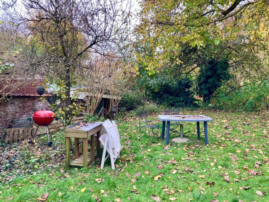 Encore en commun avec notre voisine d’en-haut : une grande cave-garage, allée de garage, parking gratuit dans la rue, deux machines à laver, et la terrasse + beau grand jardin : potager, cabane sur pilotis et tirolienne, balançoires, compost, coin feu et plein de fruitiers.