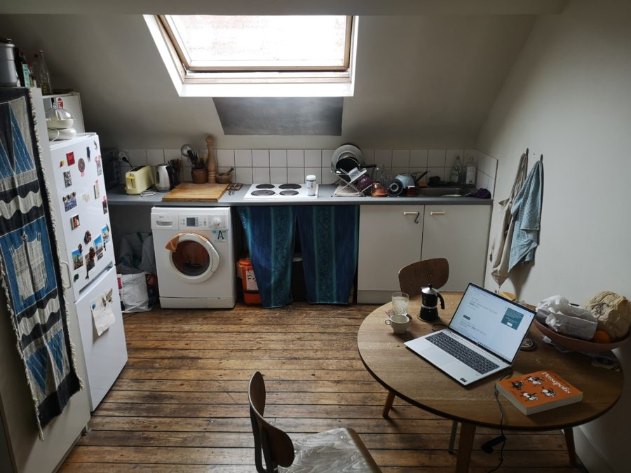 L’appartement est à reprendre à partir de débout d’août. Le contrat est annuel mais éventuellement on peut aussi parler de sous-location. À ce moment-là je paie 635 euros par mois, frais inclusif.