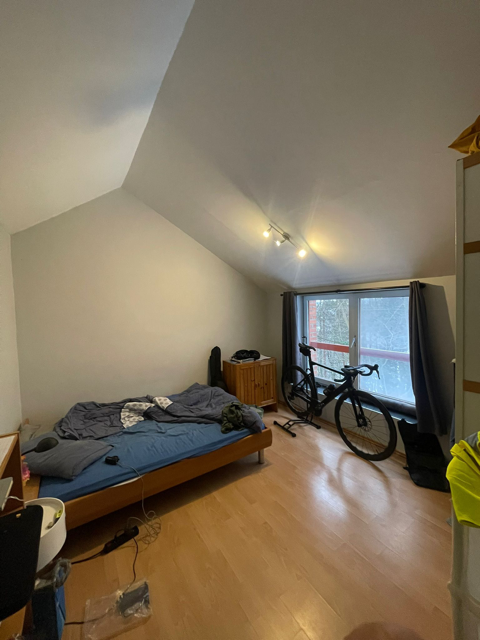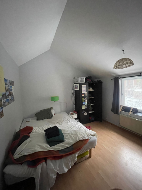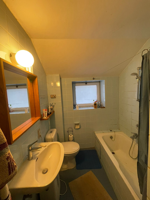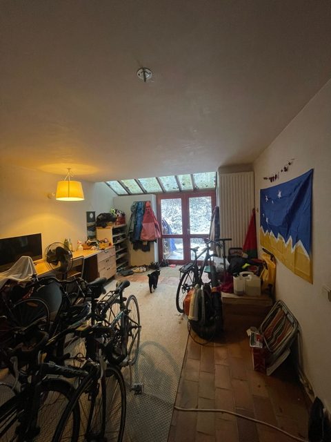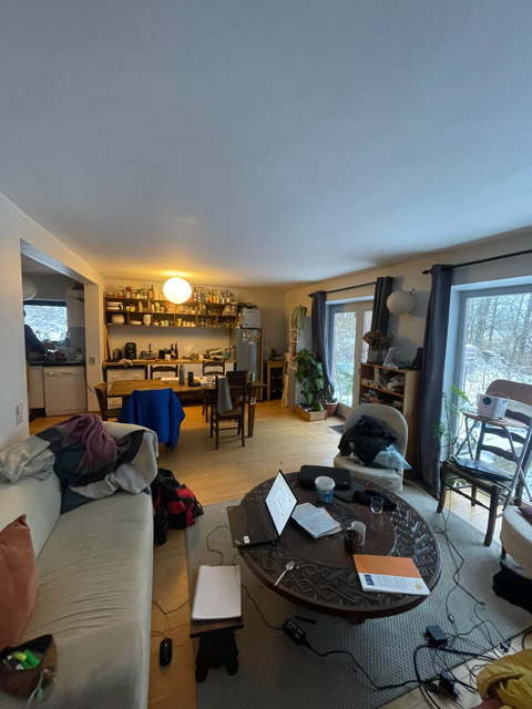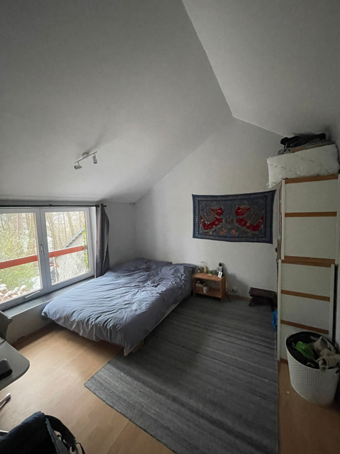 La maison comporte au rez de chausee un grande halle d’entrée avec toilette et buanderie, une cuisine ouverte, une salle a manger et living comprenant un poele Stuv et avec un acces sur le jardin privative et le bois. En haut 4 chambres et une salle de bain. Chaque niveau mesure environ 75m2. En sous-sol, une grande cave avec acces exterieur.