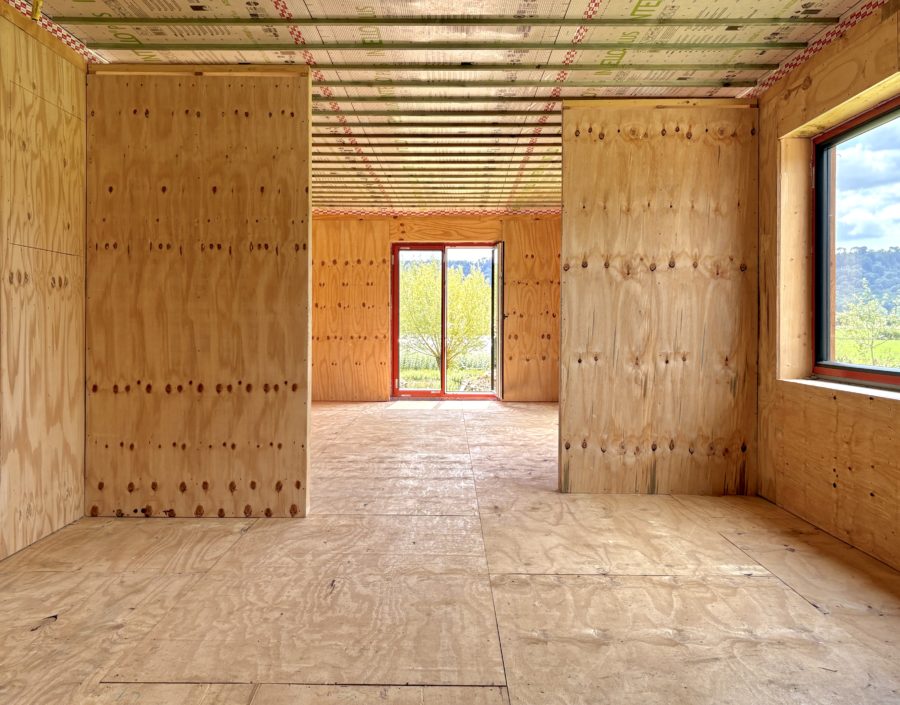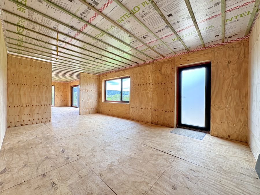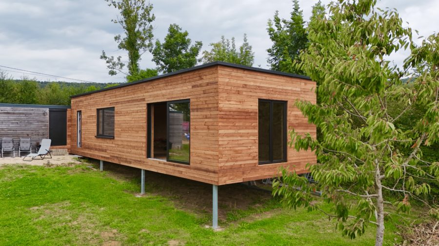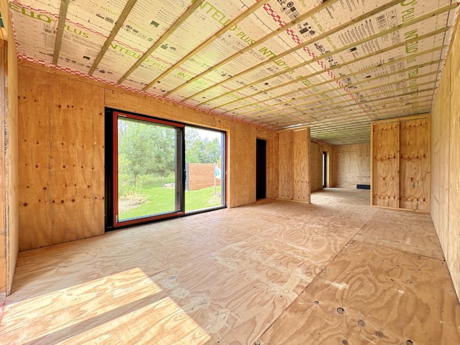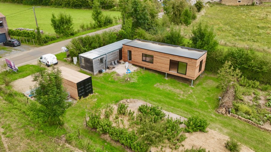 Construction en ossature bois : Une construction neuve (juin 2024) de 52 m², sur pilotis (afin de préserver la perméabilité du sol) avec permis d’urbanisme octroyé. Ultra-isolée en fibre de bois (toit, murs et sols), bardée en bois de douglas