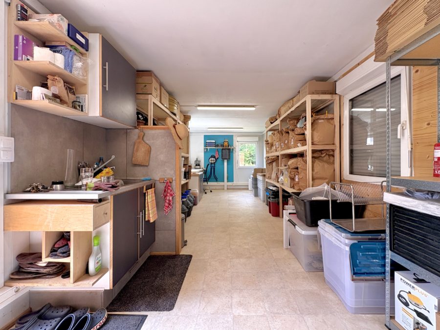Atelier “Portakabin” : Atelier de 12×3 m (36m2) bardé de bois Douglas, équipé de cinq fenêtres, un poêle à pellets, et un évier avec chauffe-eau. Utilisé jusque fin 2024 comme atelier de séchage et de stockage des plantes aromatiques et médicinales. Celui-ci pourrait être affecté à d’autres activités.