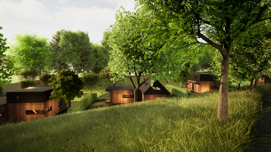 Ce seront dix habitations bioclimatiques en douglas des Ardennes (PEB A++), séjour de 40 m2 avec une grande baie triple vitrage donnant sur une terrasse de 25 m2, cuisine intégrée, buanderie, salle de douche, 2 à 3 chambres, autonomes en énergie et en chauffage, elles seront posées sur pieux sans aucune artificialisation du sol.