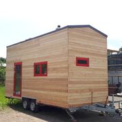 Tiny aménagée à vendre, en bois de mélèze et cadre rouge, style épuré. Enveloppe construite par Quadrapol, aménagée par un menuisier local. J’y vis depuis 5 ans, 7 mois sur l’année (pas l’hiver). Elle mesure 6m de long, 2.50 de large et 4 de haut à partir du sol. Raccordement à l’électricité et eau de ville.