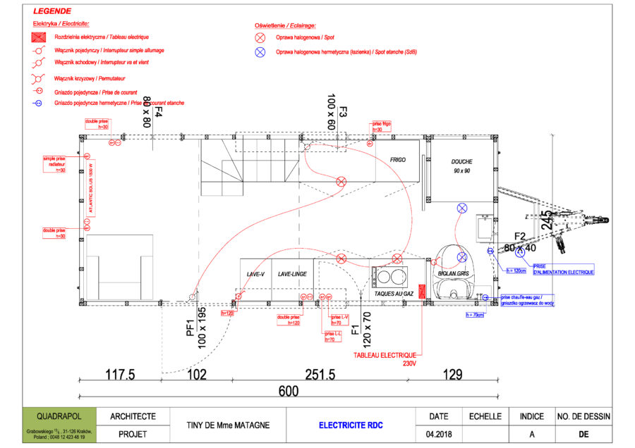 – une cuisine avec frigo, taques au gaz et suffisamment d’armoires pour ranger le nécessaire. Espace et tuyaux prévus pour mettre un petit lave-vaisselle ou un petit lave-linge.